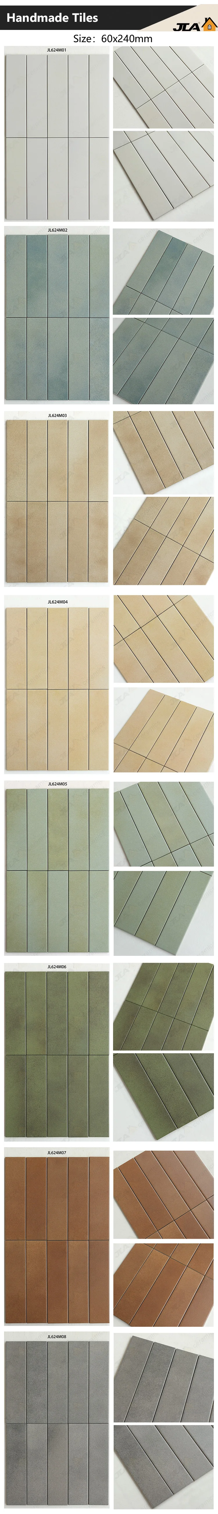 Gạch ốp tường bằng gốm thủ công của chúng tôi không chỉ có hình ảnh bắt mắt mà còn bền và linh hoạt. Chúng lý tưởng cho nhiều ứng dụng khác nhau, cho dù bạn đang muốn cải thiện tấm ốp tường nhà bếp, tạo ra một bức tường bắt mắt trong phòng khách hay tăng thêm nét sang trọng cho phòng tắm của bạn. Kết cấu phong phú và màu sắc rực rỡ của những viên gạch này sẽ dễ dàng nâng cao thiết kế nội thất của bạn, mang đến bầu không khí ấm áp và hấp dẫn.