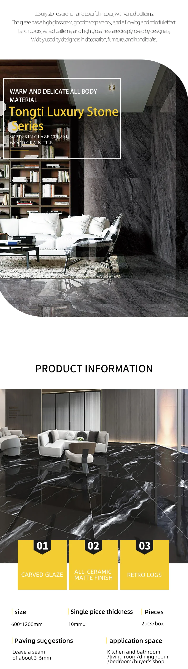 Gạch Porcelain ốp tường lát sàn phòng khách 600*1200mm men bóng sang trọng, chất lượng cao, mẫu miễn phí